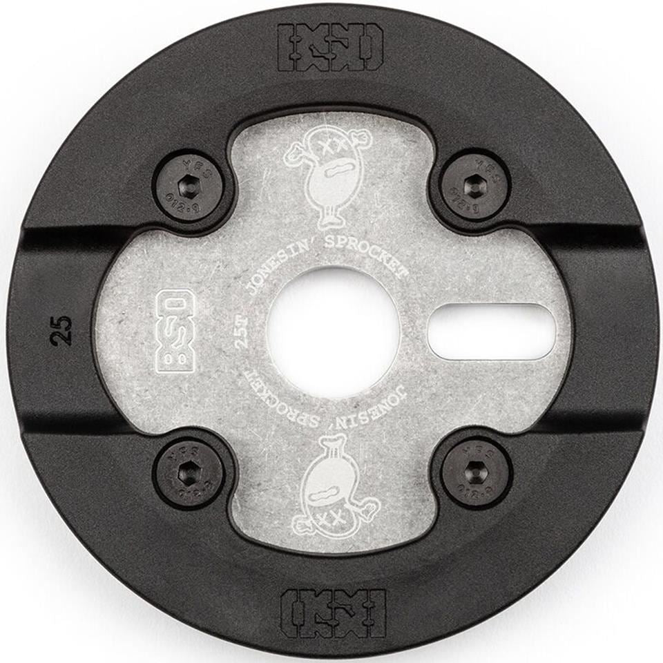 The BSD Jonesin' Sprocket is the result of Sam Jones choosing his own signature sprocket, mixing the Barrier Sprocket's nylon guard with a solid chainring.