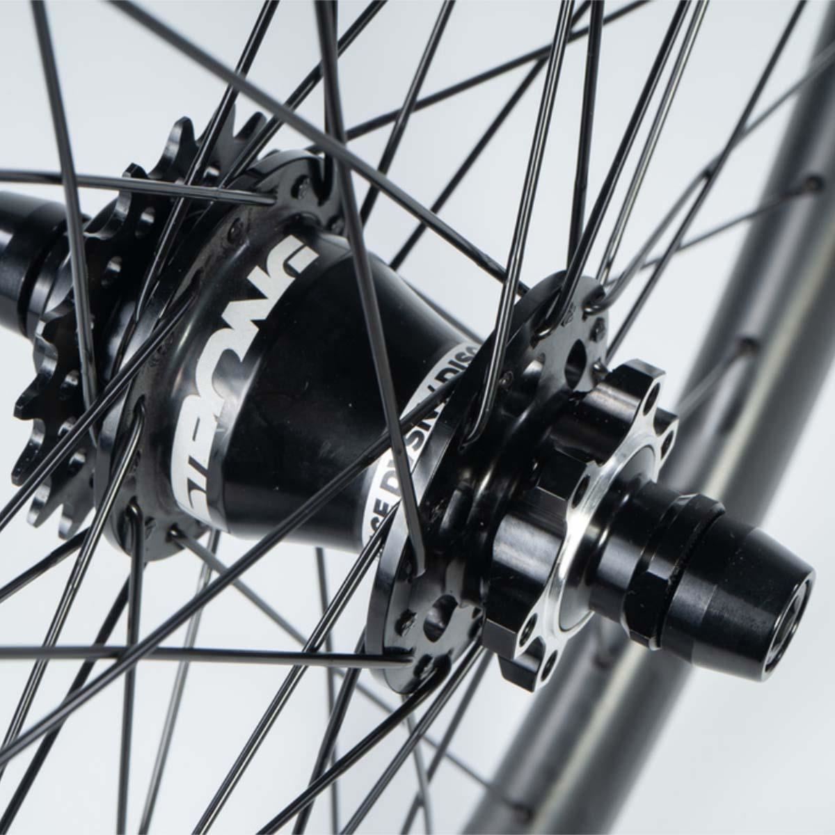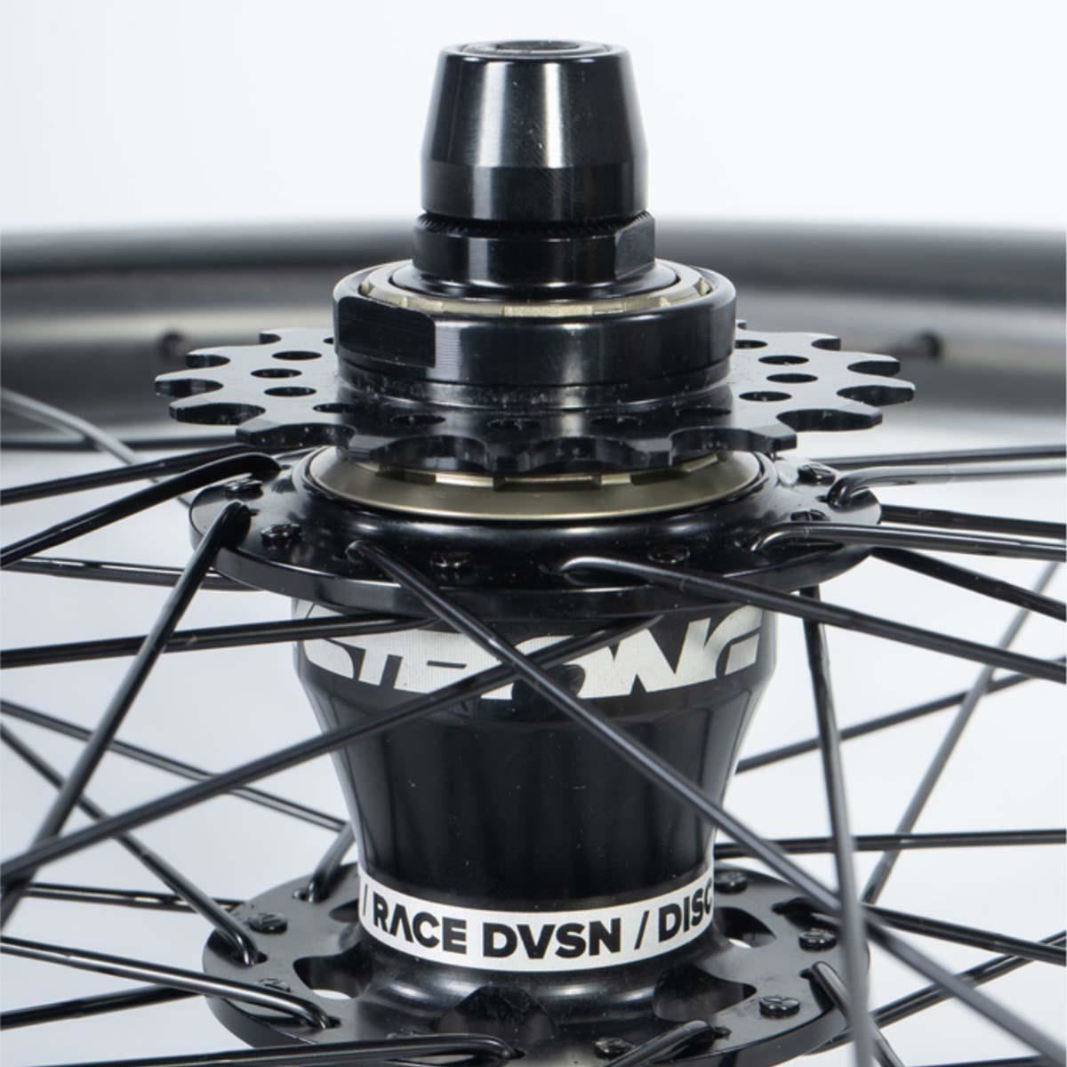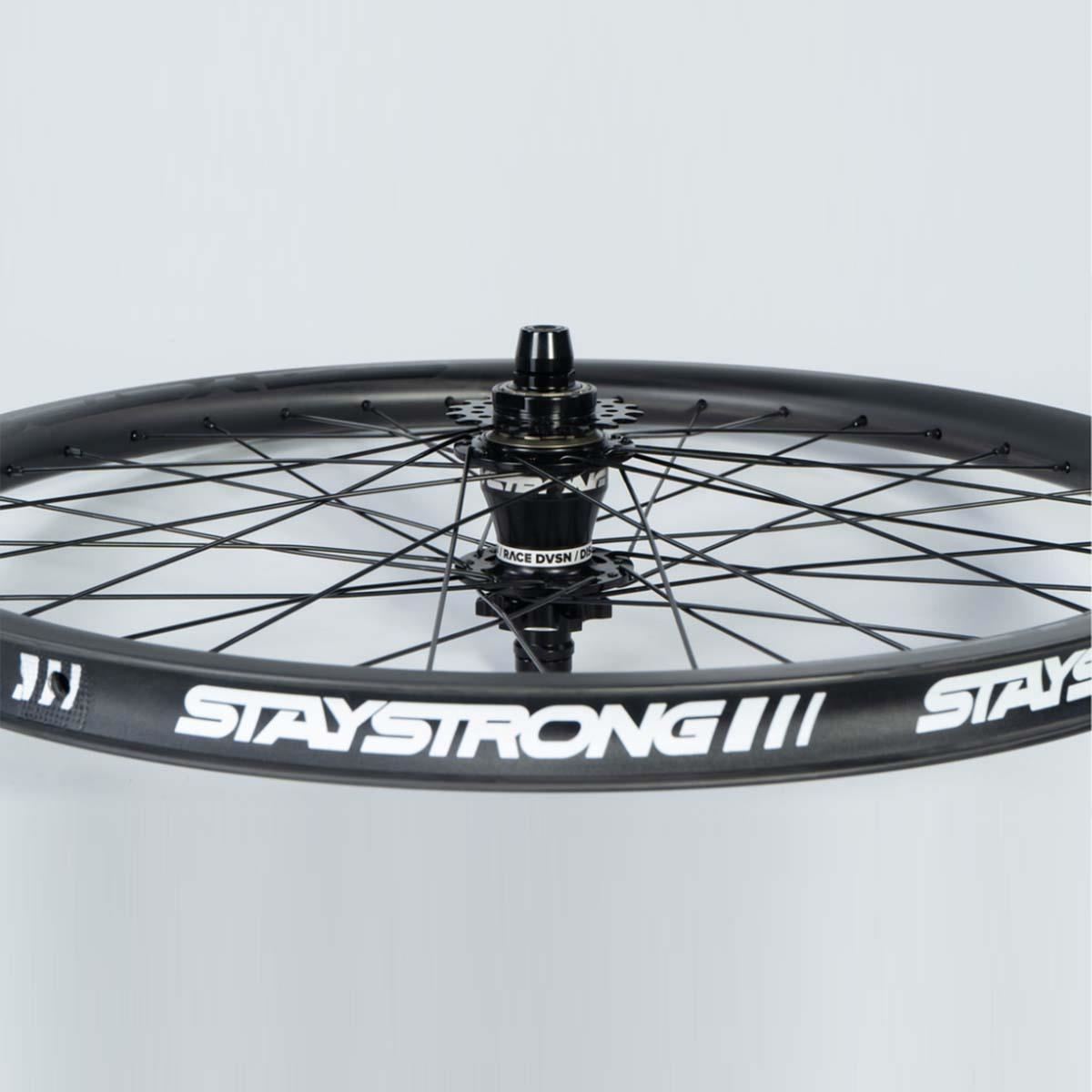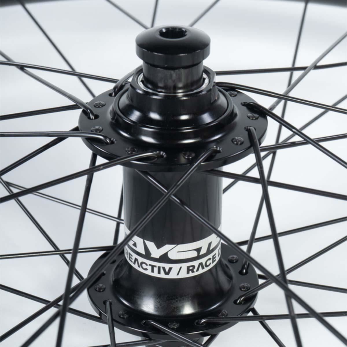 Premium Stay Strong Matte Carbon race rim with gloss water decals and a smooth finish. The rear rim is laced to a sealed alloy 10mm Reactiv hub with a 17T cassette, 6 pawls and 180 points of engagement. The front is laced to a sealed alloy 20mm thru axle Reactiv hub. Brake disc kit and adaptor sold separately.