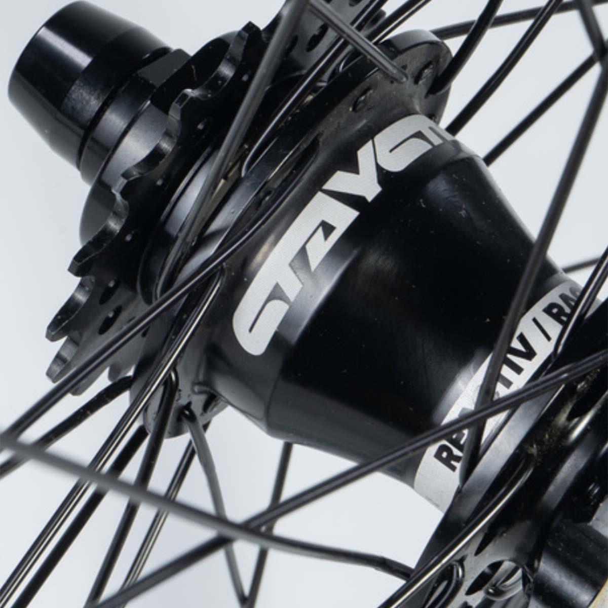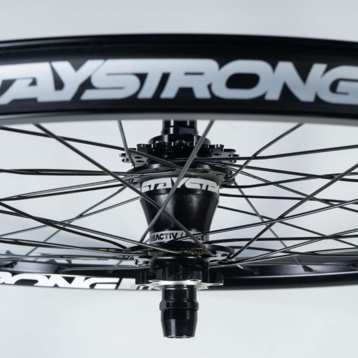 The Stay Strong Reactiv Rim features an aero profile design with a pinned joint and a CNC machined braking surface on the rear rim with Stay Strong cut of graphics. The rim is laced to a sealed alloy Reactiv hub with 16T cassette at the rear with 6 pawls and 180 points of engagement. Brake disk not included.