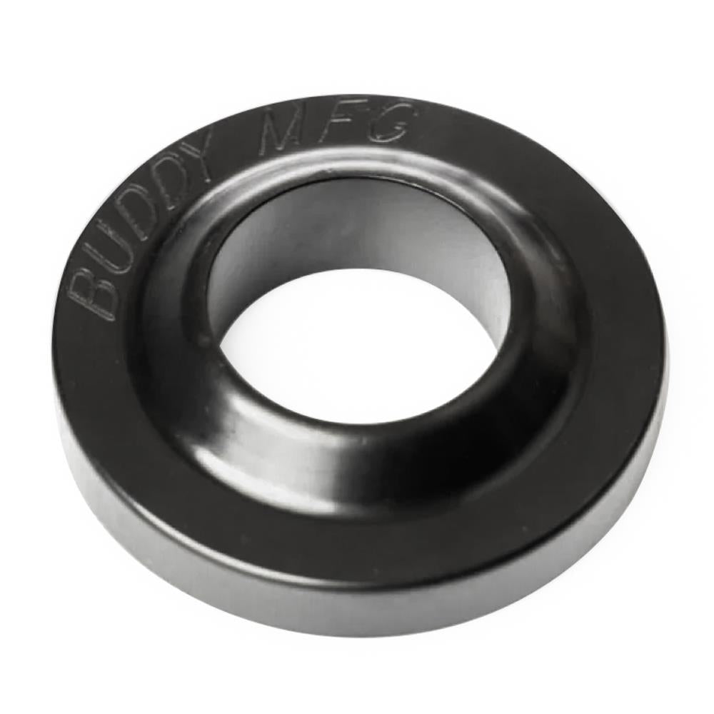 The BB Buddy is a replacement non-drive bottom bracket spacer made for abuse and will give your frame some added protection. It sits at a slightly bigger diameter than your bottom bracket shell and is made out of post heat treated 4140 (the same stuff as a decent metal peg); this glorified washer will slide grinds faster and lock in better, ensuring your BB bearings won't melt to dust.