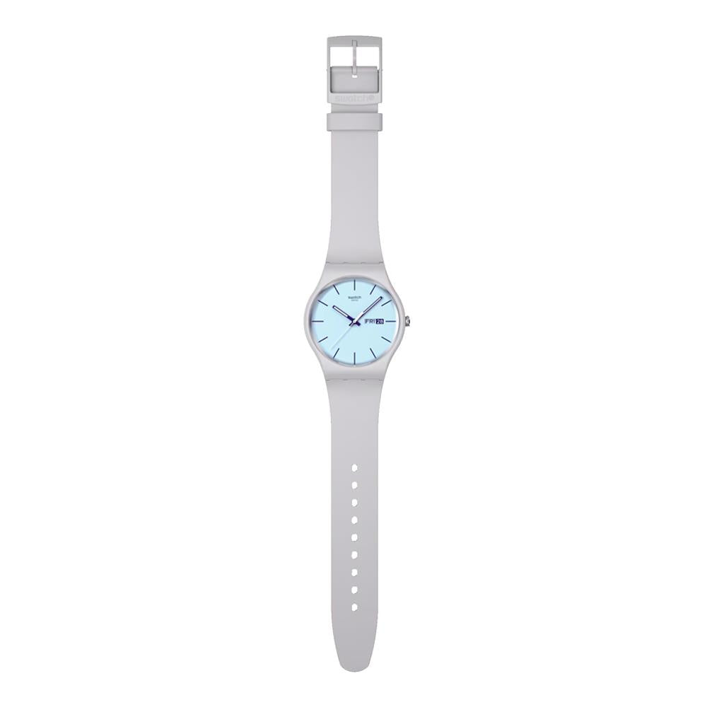 Dark purple hour and minute hands with glow-in-the dark effect and a white seconds hand point to the time under the biosourced glass. A matte light gray biosourced case with with matching strap, loop and buckle complete the watch.