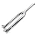 1-piece machined steerer tube with an integrated bearing race, tapered legs, a 28mm offset and tyre clearance for 2.4" tyres.