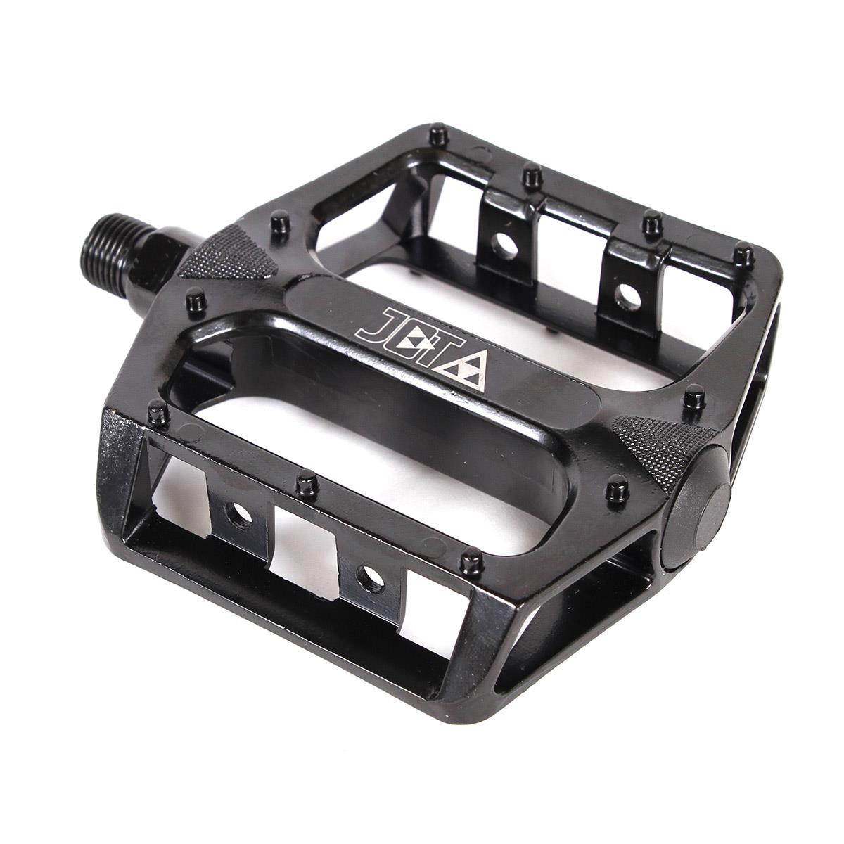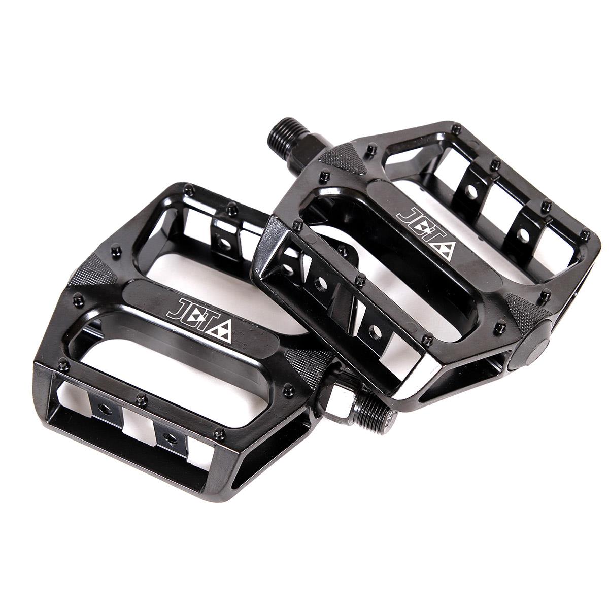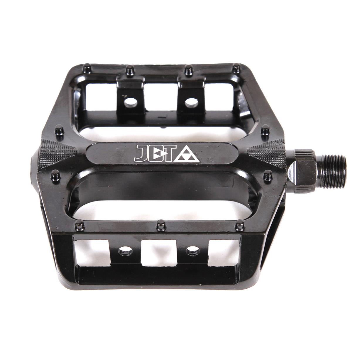Classic platform BMX pedal from Jet BMX. These pedals are made from forged alloy for maximum durability and feature a concaved shape with moulded pins and knurling on the edges for better grip. Suitable for freestyle or BMX racing.