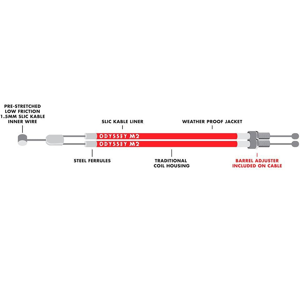 The M2 cable is made using the same technology as the Slic Cables. The M2 features a heavy duty section that connects the two lugs that makes it almost impossible to break. Comes with barrel adjusters outers and inner cables. Comes in black only. This Replacement Cable is for the Odyssey M2 Lever. Length: 440mm.