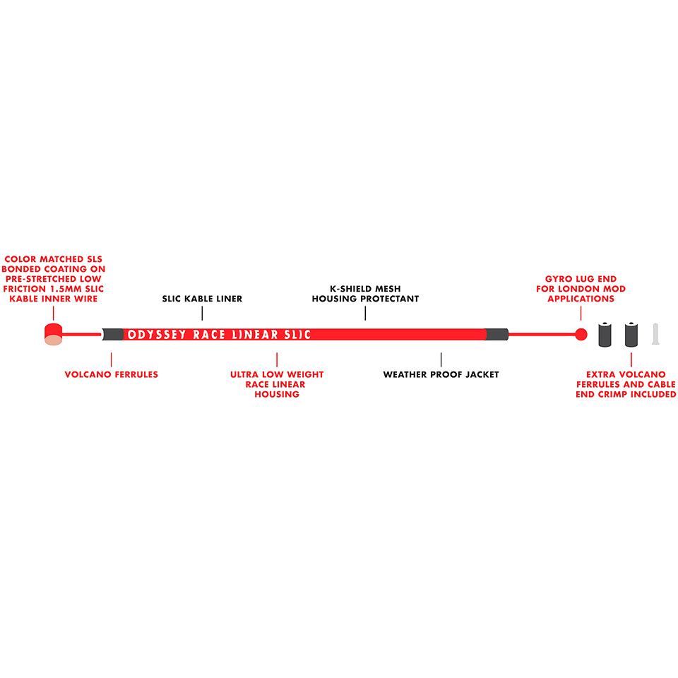 Odyssey have taken their proven Linear Slic cable housing and replaced the steel linear wire with aluminum. Utilizing the aluminum wire in the housing saves you significant weight, roughly 37%. This cable also features Odyssey's specially designed volcano ferrules that prevent housing blowouts. This cable also comes with color-coated inner wires and ball ends to differentiate between our regular linears. Race Linear Slic cable - 2 oz. Regular Linear Slic cable - 3.2 oz. Length: 65".