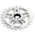 Requires no sprocket bolt. Instead, it has a hardened CrMo steel insert in that matches up to the 48 splines on the crank axle for pure, direct power transfer. Available for 19mm splined axles only. 1/8″ tooth width for use with most freestyle/street & single speed chains.