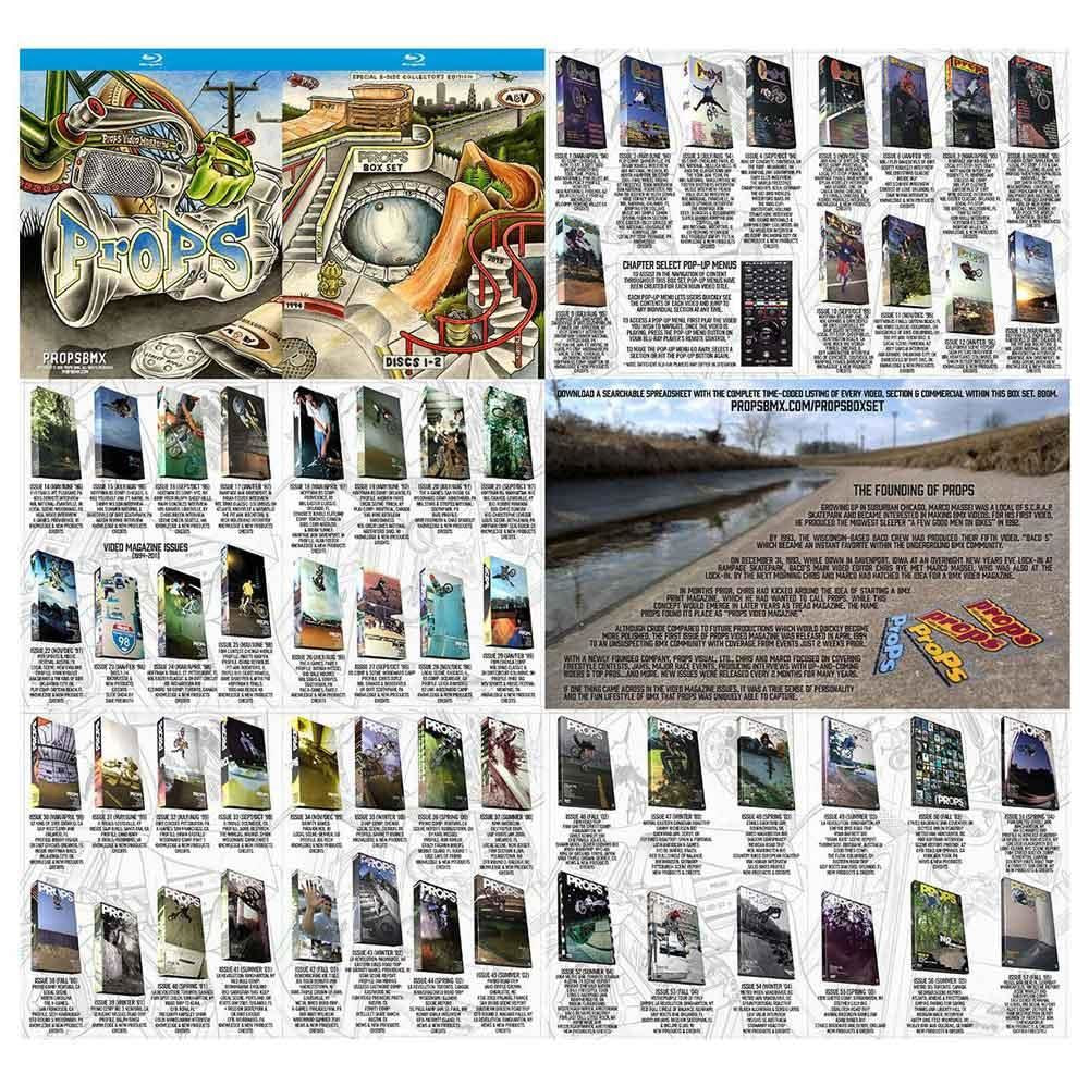5 Disc Blue-ray box set from Props. Featuring: All Video Magazine Issues 1 - 78 (1994-2011), all 20 Year End Best Of’s & all Credits Compilations. All Special Releases - including Groundwork, Euroscene, Passports, Metrojam & Owned. Over 100 bonus sections aggregated from Issues & Special Releases. All original commercials included in every Issue. Bonus videos from Props’ founders - including "A Few Good Men" and "Baco 5". Beautiful 1080p motion menus featuring high res photo loops. Chapter select pop-up menus for every video in the box set. All videos sourced from 1st-gen analog and/or digital masters. Nearly 120 hours of high quality H.264-encoded content. Dolby Digital Professional audio. –Mid-school bible with over 20 years of BMX history, progression & Props-style documentation.