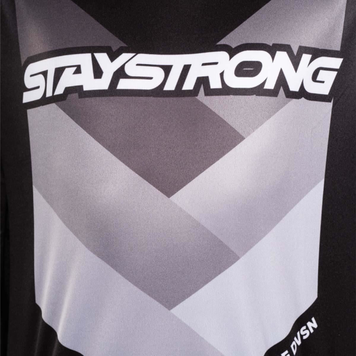 100% polyester youth race jersey from Stay Strong with comfortable neck panelling and printed graphics on front and rear.