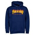 Thrasher 'Flame Logo' Navy Hoodie featuring the classic yellow Thrasher flame logo on front. Heavyweight, 90% cotton 10% polyester hooded sweatshirt.